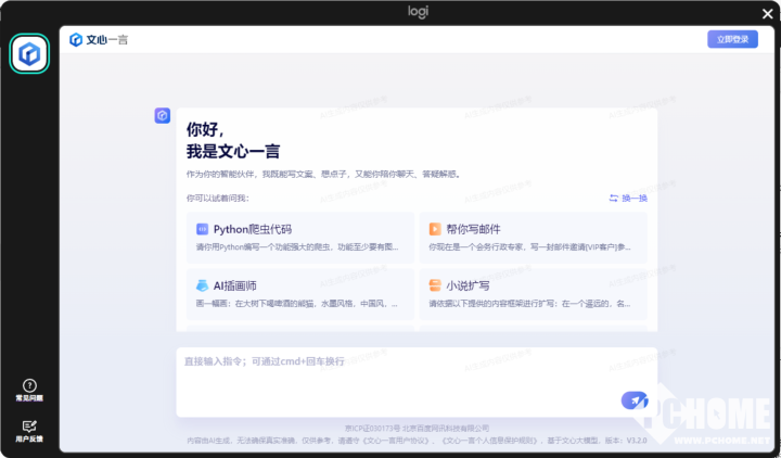 首先就是与AI相关的功能了,Logi Options中提供了AI调度台,支持通过快捷键一键唤起,之后就可以直接使用唤起的AI大模型。目前该调度台仅内置了文心一言,在工作时就可以直接让AI生成一些参考文案、对已有内容进行润色、制作配图,或是询问一些问题,使用体验还是相当方便的。不过目前仅支持一种大模型还是稍显匮乏,希望后续能够增加更多的大模型以供选择。