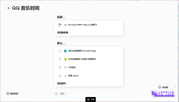 除此之外,Logi Options还可以通过Smart Action自定义工作流一键实现一系列的复杂操作,K98M的F4~F12以及右上角的4枚按键可以自定义功能。尽管看起来十分类似宏功能,但比起一般的宏功能可玩性更强,有些类似于苹果手机上的快捷指令,更偏向日常及办公场景,功能更为丰富。