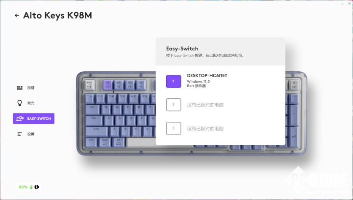 连接方面,罗技琥珀系列K98M支持使用Logi Bolt无线连接器以及蓝牙双模进行连接,尽管键盘后面配备了Type-C接口,但接口仅支持充电,不支持有线连接设备进行使用,也是这款键盘的一个小小遗憾。该款键盘还支持快速切换设备,可通过F1~F3按键在3台设备之间快速切换。