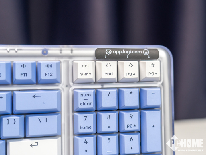 外观方面,罗技琥珀系列K98M采用了标准的98配列,右下角的方向键采用了下沉式的设计,在布局上是相对较为常规的配置。但仔细观察键位可以发现,右上角的四颗快捷键除了常规的键帽标注之外,还有着几个神秘的图案吸引着我们的注意力,上方的贴纸已经说明了这几个按键需要搭配软件进行使用,究竟有什么功能?稍后我们再来体验。
