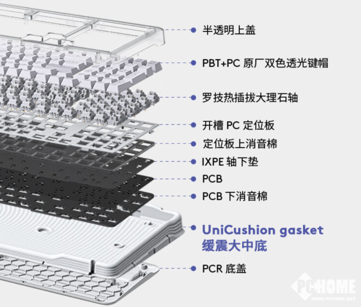 可以说罗技这次在设计上是颇具想法的,实测敲击手感也是相当稳定,除了缓震大中底之外也得益于定位板、PCB上下消音棉、IXPE轴下垫等等用料,最大程度保持了手感一致性,消除了共振和空腔音。