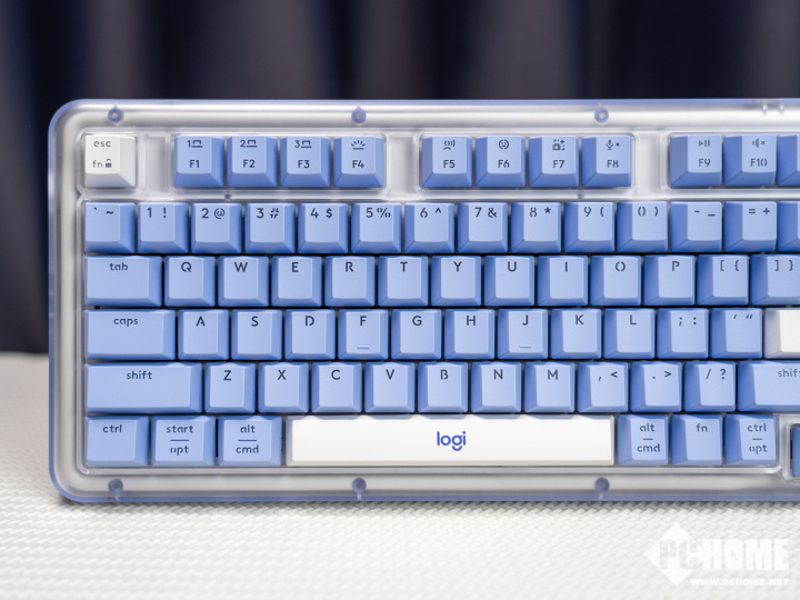 配色方面,罗技琥珀系列K98M提供了三种配色可以选择,分别是石墨灰、珍珠白、星暮紫,我们此次收到的是更为亮眼的星暮紫配色,大部分键帽以及底版都采用了偏淡的紫色设计,搭配透明透明区域以及几枚白色键帽,拼色下颜值还是相当出色的。