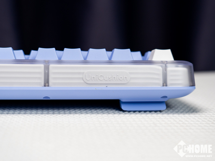 除此之外,该款键盘的顶壳采用透明设计,可以透过顶壳直接看到键盘当中硅胶材质的UniCushion Gasket缓震大中底,这也是罗技琥珀系列K98M键盘的一大亮点,也是罗技首次在旗下键盘当中带来类Gasket结构,罗技使用了一整块大面积的硅胶垫将键盘的定位板和PCB整个包裹起来,进一步提升了键盘的手感和优化打字时的敲击音。