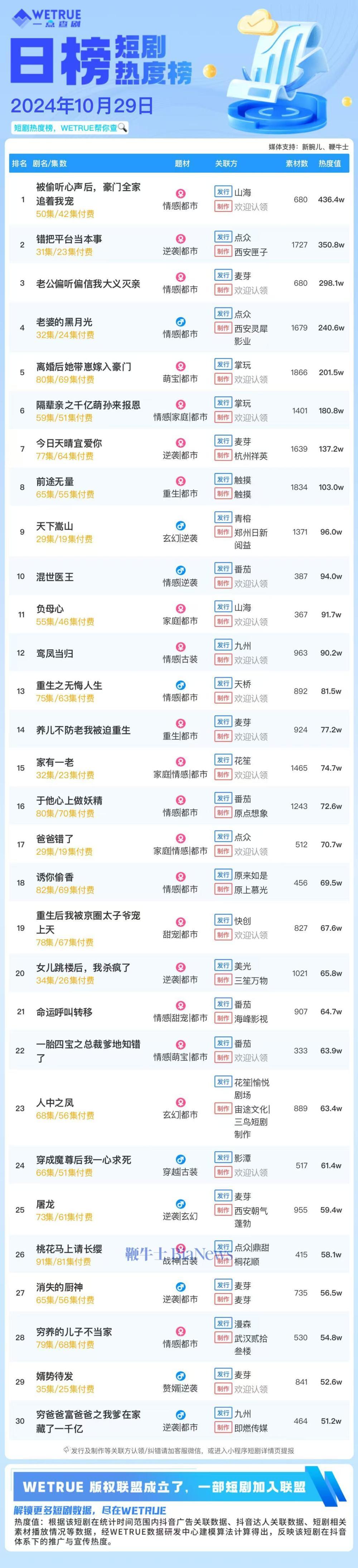 编者按:为帮助短剧从业者提供更多信息,专注于短剧报道的新腕儿和科技媒体鞭牛士联合WETRUE短剧热度榜共同推出短剧热度榜。