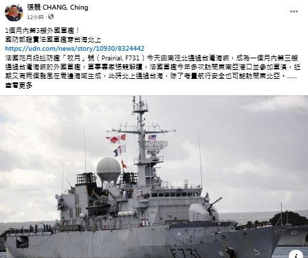 张竞解读,法国军舰此时北上通过台海,除了考量航行安全也可能访问东北亚。(张竞 CHANG,Ching脸书)