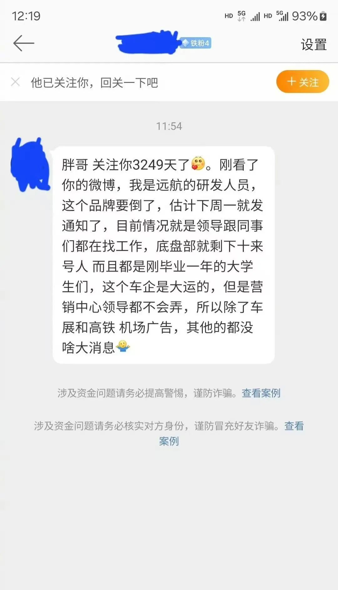 近日,远航汽车被曝经营危机,爆料人士称这个品牌要倒闭了,估计下周一就发通知了,目前情况是领导和同事们都在找工作,底盘部就剩下十来号人,而且都是刚毕业一年的大学生们。
