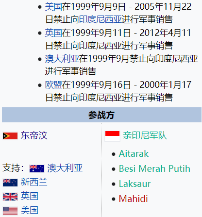 1999年9月9日—16日,美国、英国、澳大利亚、欧盟相继宣布对印尼实施武器禁运,美国更是威胁要取消国际货币基金组织对印尼的贷款援助,这对于深陷亚洲金融危机的印尼来说无异于釜底抽薪,印尼最终同意全面从东帝汶撤军并允许以澳大利亚军队为主的联合国维和部队进驻东帝汶。
