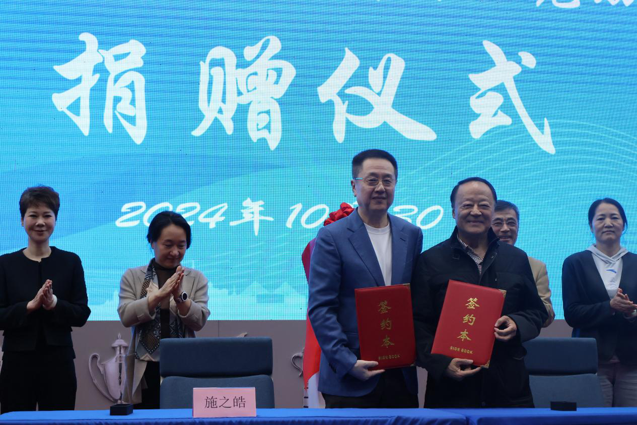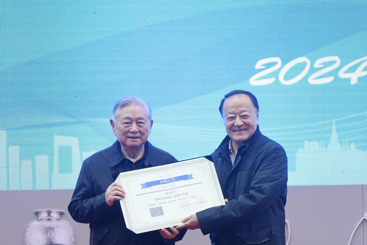 中间悬垂着奥林匹克五环标志,两侧各延伸出一枝象征和平、友谊的橄榄枝,这根酷似银色项圈的藏品便是奥林匹克勋章(银质),它已成为上海国际乒联博物馆和中国乒乓球博物馆(以下简称“乒博馆”)的馆藏。10月30日下午,国家体育总局原副局长、亚乒联终身名誉主席李富荣与上海体育大学中国乒乓球学院院长、乒博馆馆长施之皓签署捐赠协议,国际乒乓球联合会终身名誉主席徐寅生向李富荣颁发捐赠证书。