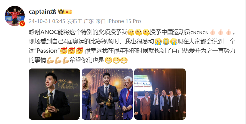 马龙随后在个人社交账号上写道:感谢ANOC能将这个特别的奖项授予我,授予中国运动员。现场看到自己4届奥运的比赛视频时,我也很感动!现在大家都会说到一个词“Passion” ,很幸运我在很年轻的时候就找到了自己热爱并为之一直努力的事情,希望你们也是!
