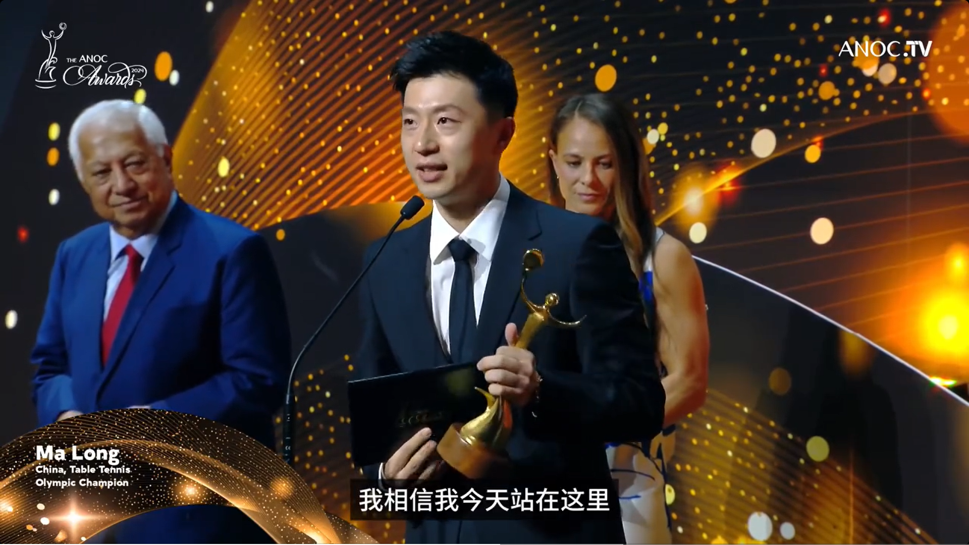 奖项揭晓后,马龙上台用英文发表了一段获奖感言:首先我要感谢国际奥协给我颁这个奖,这对我来说是非常大的荣誉,我相信我今天站在这里不仅仅代表我自己,也代表中国乒乓球队。过去21年的职业生涯确实是一段漫长的旅程,但我很幸运因为我在年轻的时候就找到了我对乒乓球的热爱,并梦想着有一天在奥运舞台上竞争,所以我一直有这个梦想,一直愿意为这项运动付出我的一切,从来没有放弃过。