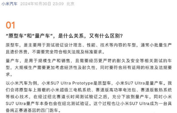 小米汽车官方表示:“原型车,是主要用于测试验证设计理念、性能、技术等内容的车型,通常小批量生产且造价昂贵,不需要完全符合相关法规及标准要求。量产车,是用于规模生产和销售,且需要经历更严苛的耐久及安全等相关测试的车型,大规模生产需要更加考虑经济性及耐久性,同时要符合所有适用的标准及法规要求。以小米汽车为例,小米SU7 Ultra Prototype是原型车,小米SU7 Ultra是量产车。原型车上搭载的小米超级三电机系统、赛道版高功率电池包、赛道版散热系统等核心技术,在经过纽北赛道长时间测试验证之后,充分下放到量产车,同时小米SU7 Ultra量产车本身也会在纽北测试验证。这个过程也让小米SU7 Ultra成为一台具备纯正赛道基因的四门跑车。”