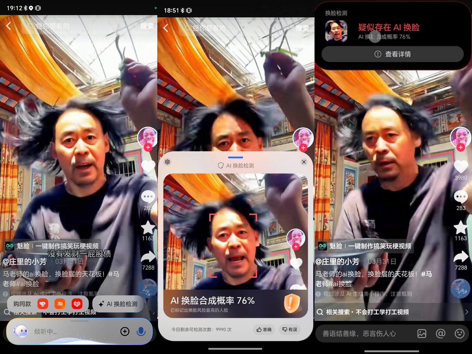 这一次荣耀 MagicOS 9.0 还带来了一个比较有特色的 AI 换脸检测功能,启动也非常简单,只需要用一般的方式唤醒 YOYO,它就会自动识别当前场景,弹出 AI 换脸检测的按键,一键完成对当前视频的 AI 检测,并且提示当前画面的威胁度。