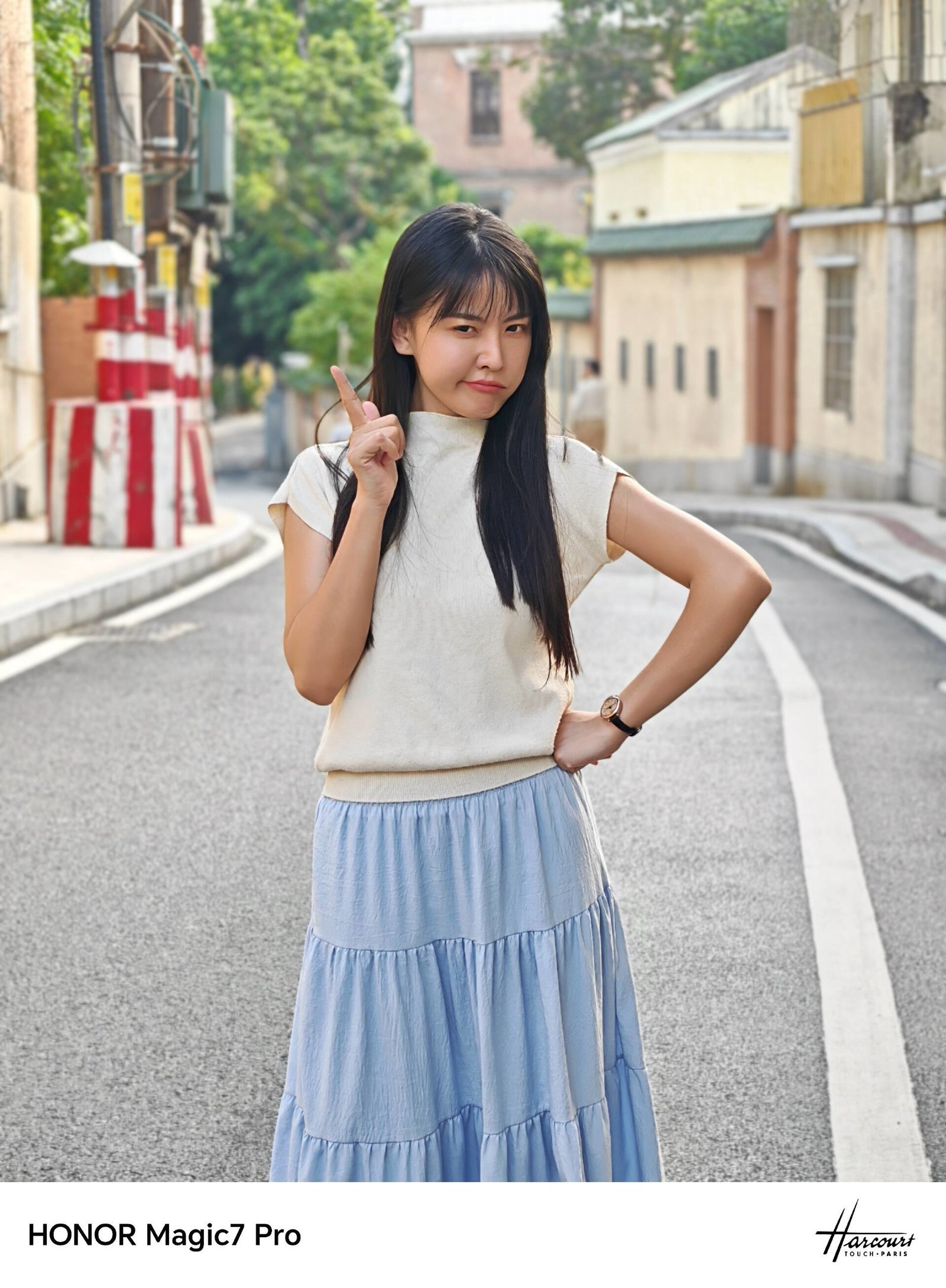 这一次 Magic7 系列的AI超清雅顾人像提供了三种模式,分别是生动和质感的不同彩色,以及一款强调对比度的经典黑白。实际拍摄下来,AI超清雅顾人像确实可以带来一些不一样的层次感,曝光的取向也比较有意思,不会一味压低高光做“正确的曝光”,而是以人像优先,优先记录模特的光采,恰到好处的美颜效果则强化了这种人物的高光,最终呈现出美妙而又真实的人像效果。