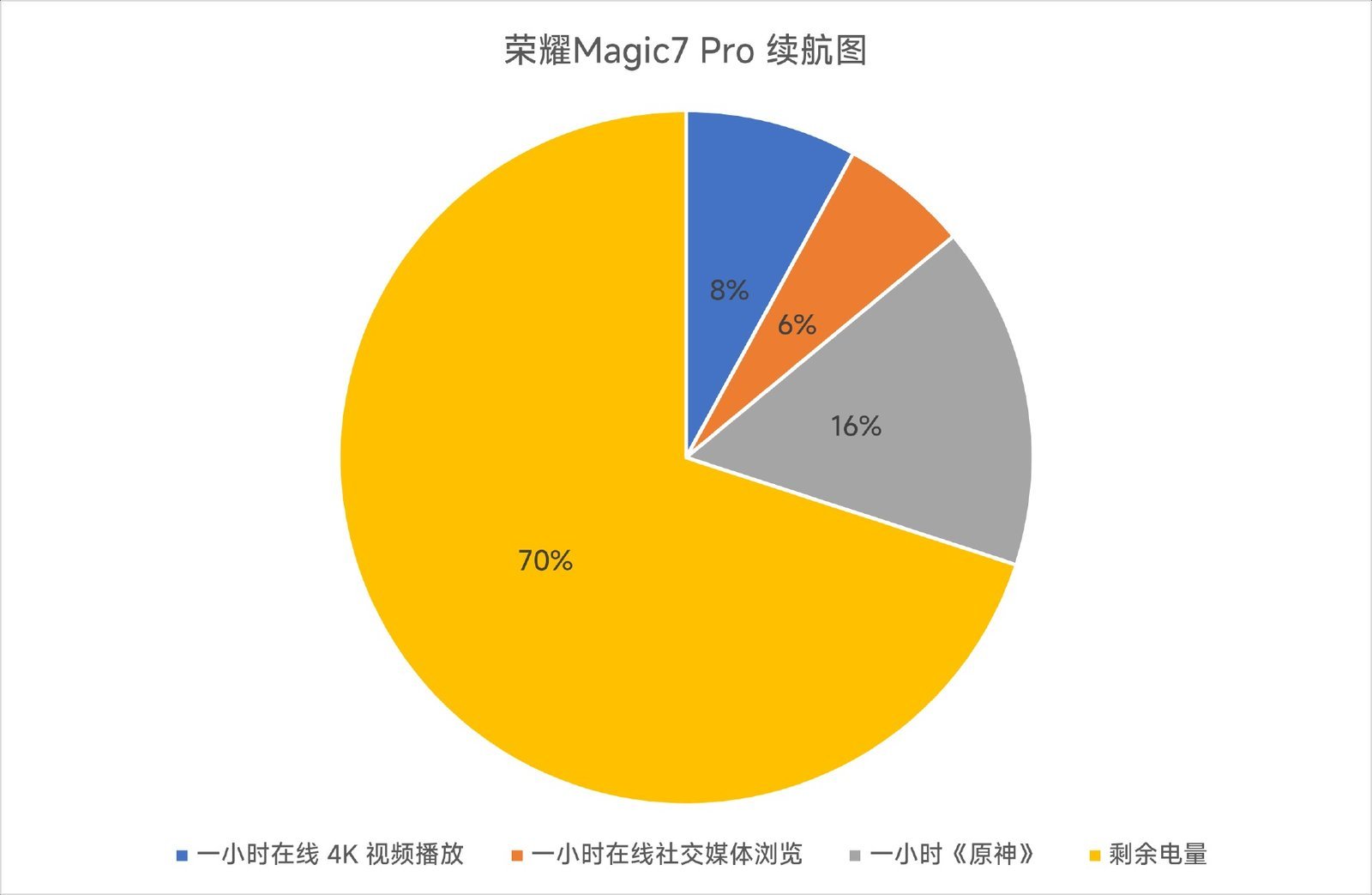 在我们的测试之中,荣耀 Magic7 Pro 的续航也确实非常优秀,无论是应对日常使用的刷视频和刷微博场景,还是在高负载的《原神》游戏场景之中,它的续航表现都相当出色,模拟的三小时使用下来,竟然还剩了足足 70% 的电,在我们过往的测试之中这也是极其优秀的水平了。