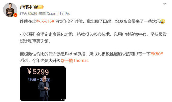 小米集团合伙人、总裁,手机部总裁,小米品牌总经理卢伟冰表示:“小米系列会坚定走高端化之路,持续投入核心技术,以用户体验为中心,坚持极致设计和审美引领。而极致性价比的使命就是Redmi承担,所以对极致性能追求的可以等一下K80系列,今年也是大升级!”
