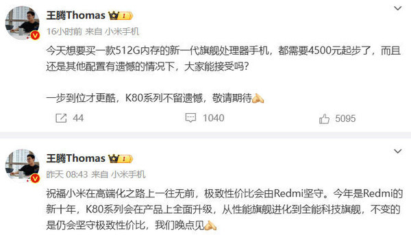 小米中国区市场部副总经理、Redmi品牌总经理王腾则表示:“极致性价比会由Redmi坚守。今年是Redmi的新十年,K80系列会在产品上全面升级,从性能旗舰进化到全能科技旗舰,不变的是仍会坚守极致性价比,我们晚点见。”“今天想要买一款512G内存的新一代旗舰处理器手机,都需要4500元起步了,而且还是其他配置有遗憾的情况下,大家能接受吗?一步到位才更酷,K80系列不留遗憾,敬请期待。”