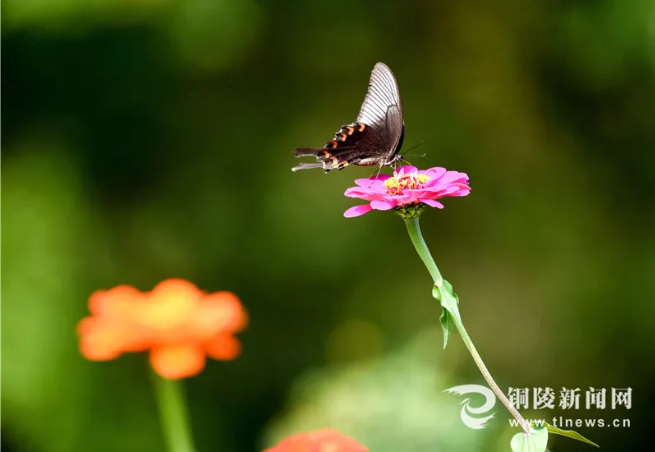 10月29日,斑斓的蝴蝶在铜陵市铜官区西湖镇柴塘村路边的百日菊上采食花蜜。随着秋日昼夜温差的加大,百日菊花蕾饱满、色彩艳丽,一只只蝴蝶在花丛中轻轻舞动,不时地在花朵上驻足,辛勤地采食花蜜,构成一幅幅美丽的自然画卷。(过仕宁)