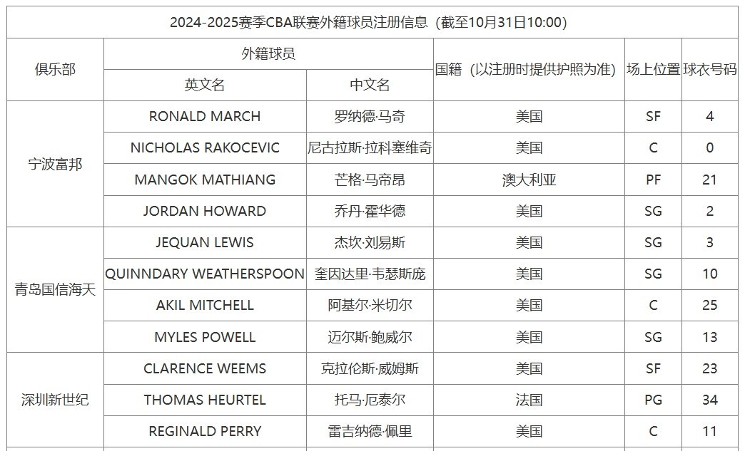 北京时间今日10点整,CBA官网更新2024-25赛季联赛外籍球员注册信息,考利-斯坦、凯-费尔德注册成功,正式加入同曦男篮,青岛男篮也注册成功了杰奎安-刘易斯。