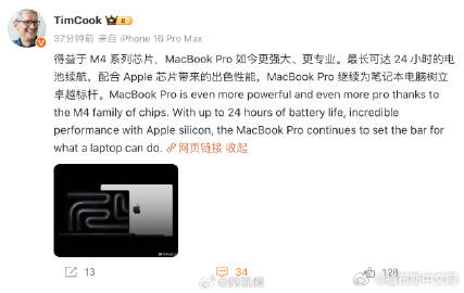 【#库克回应2024款MacBookPro发布#,#库克称MacBookPro为笔记本树立了标杆#】10月31日上午,苹果CEO库克@TimCook 发文表示,得益于M4系列芯片,MacBook Pro如今更强大、更专业。最长可达24小时的电池续航,配合Apple芯片带来的出色性能,MacBook Pro继续为笔记本电脑树立卓越标杆。