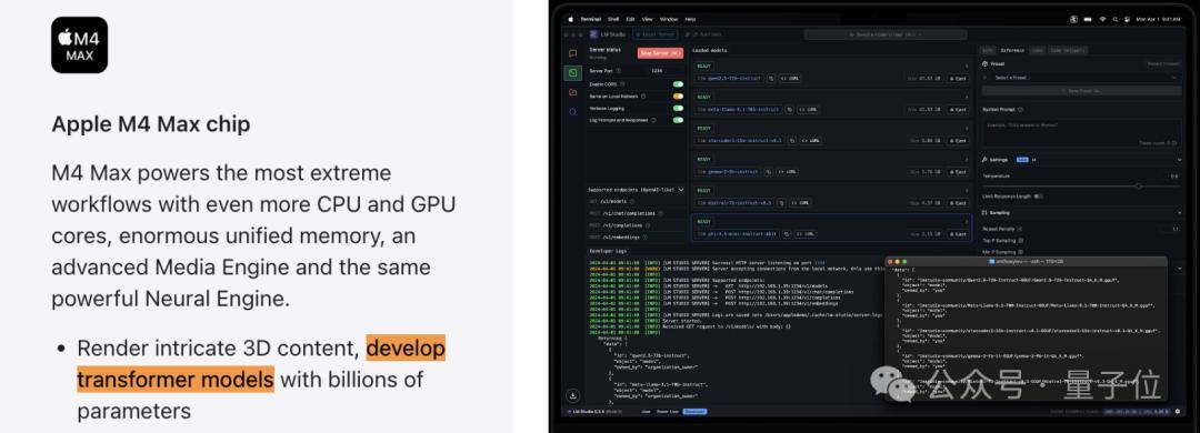 甚至如开头所述,按照苹果的官宣,M4 Max笔记本拿来开发数十亿参数的Transformer模型也不是问题。