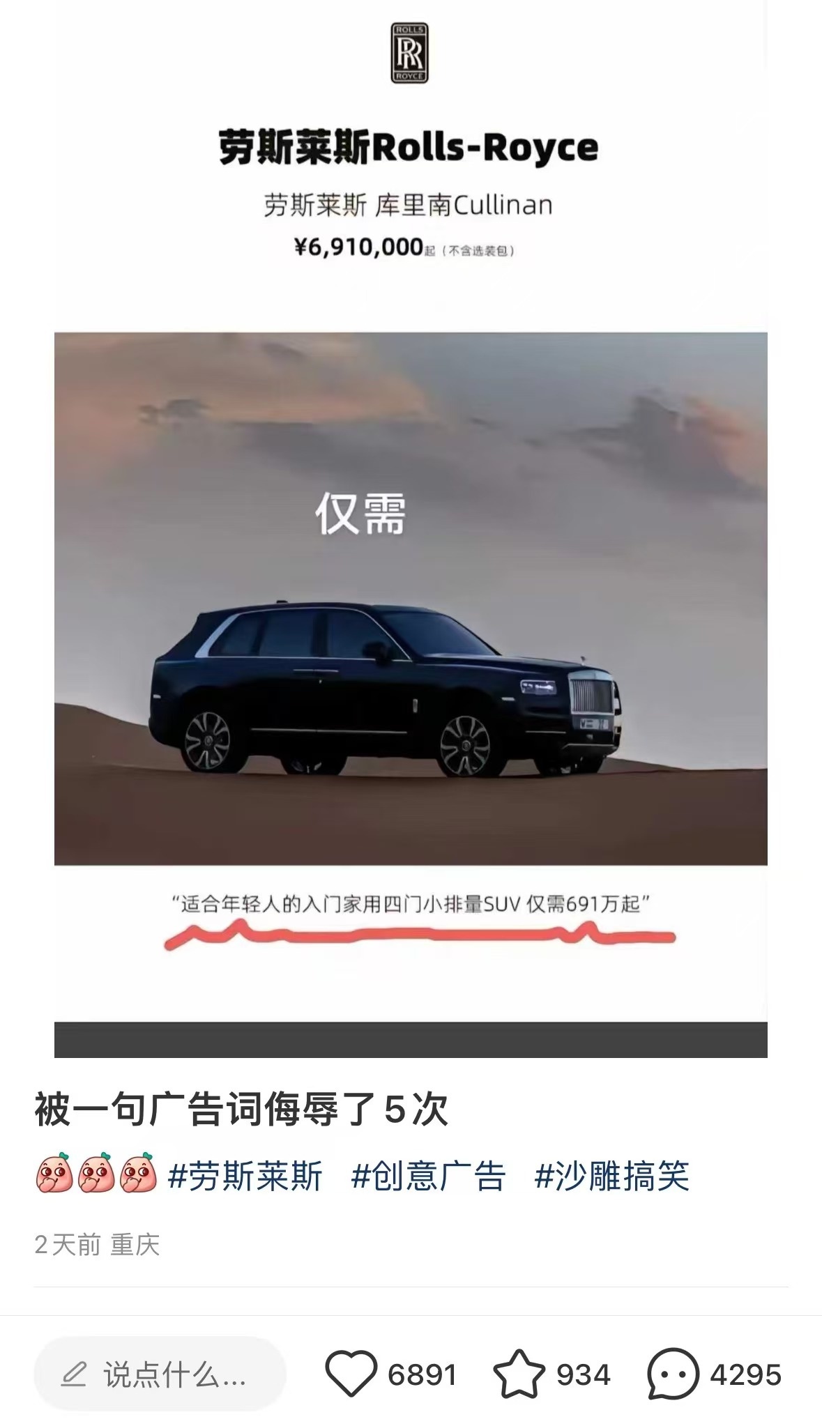 10月31日,多位网友发贴称“被劳斯莱斯广告词侮辱”。网传一张形似宣传海报的图片显示,“劳斯莱斯库里南,适合年轻人的入门家用小排量SUV,仅需691万起”,在多平台引发争议。有网友称,一句广告侮辱了我五次,心凉透了。