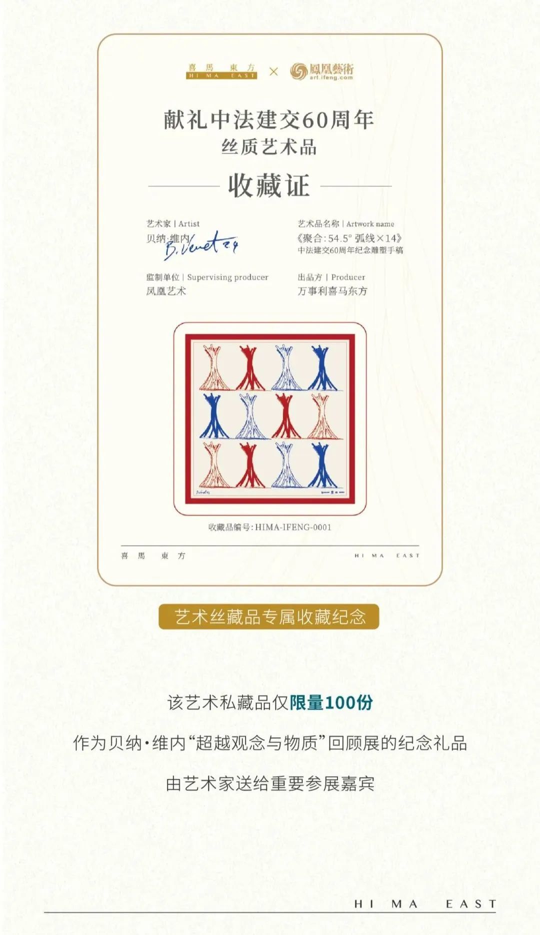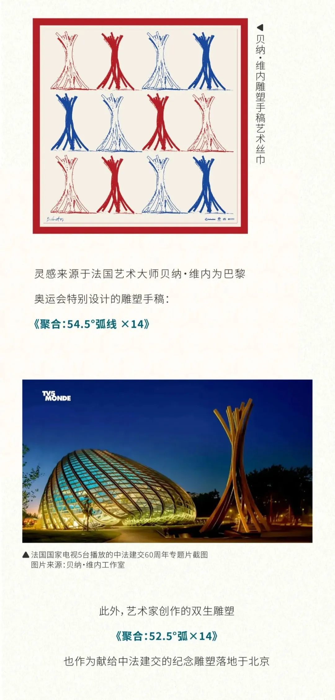 恰逢中法建交60周年,艺术丝巾的推出也象征着两国之间文化友谊的深度交融。贝纳·维内的双生雕塑《聚合:52.5°弧X14》作为纪念雕塑落地北京,象征着不同文化和思想的连接。而他的艺术理念通过丝巾这一载体,再次得以传递。