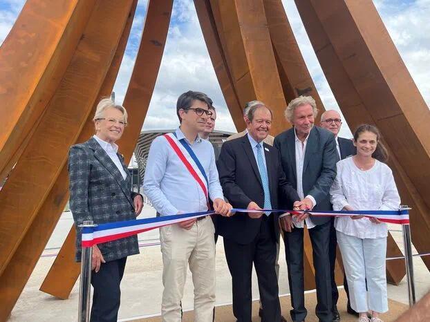 ▲《聚合:54.5°弧 × 14》落成现场:艺术家贝纳·维内(Bernar Venet,前排右二)、大巴黎都会区主席帕特里克·奥利尔(Patrick Ollier,前排中间)和圣德尼市市长马蒂厄·阿诺坦(Mathieu Hanotin,前排左二)图片来源:https://www.leparisien.fr/