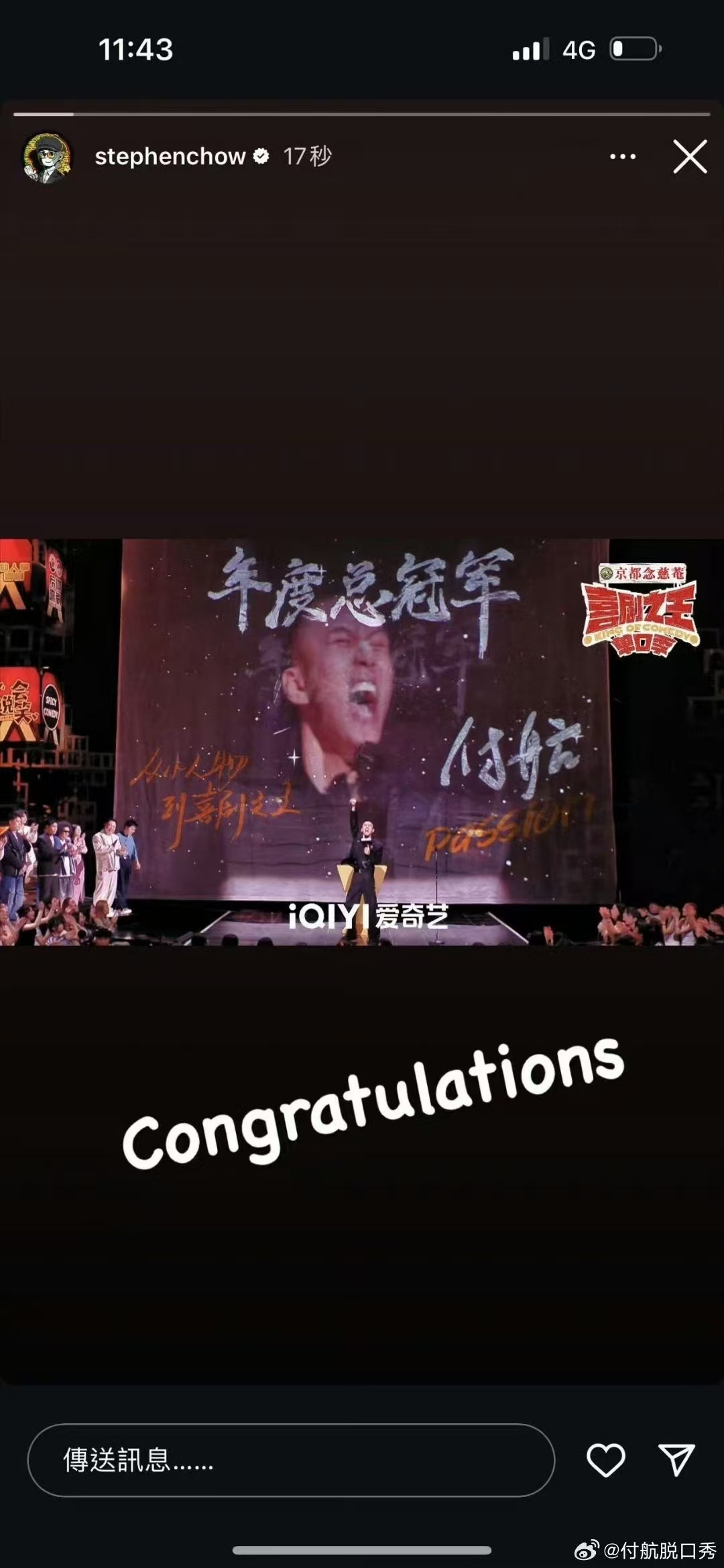 周星驰祝贺付航夺冠。图/付航微博