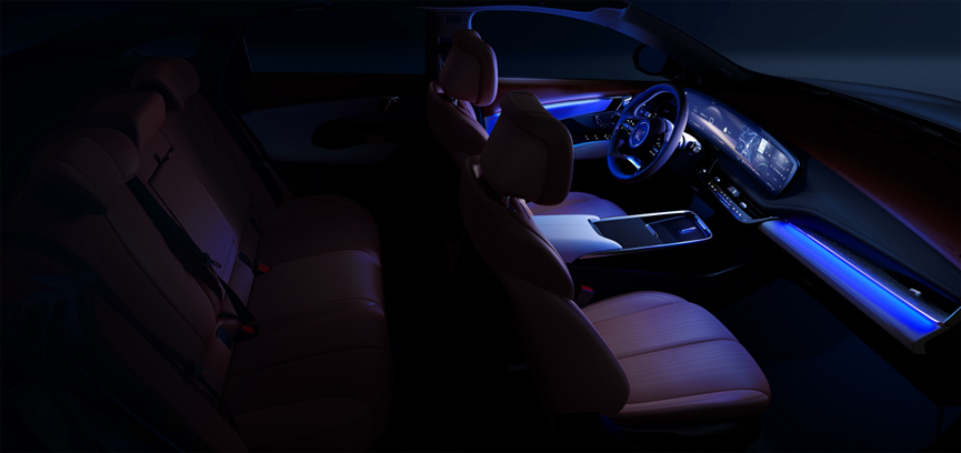 设计上,围绕游艇式悬浮中控台营造出环绕座舱的大气格局。前排以驾驶者为中心,从造型优美的30吋弧面6K屏、精巧的电子怀挡,到悬浮中控台,结合典雅纯净的蓝白内饰双拼色,营造出驾驭豪华游艇的快意氛围。全车内饰用材高档,做工精致,并融入新科技、新工艺,让豪华、时尚、优雅渗透在细微中。