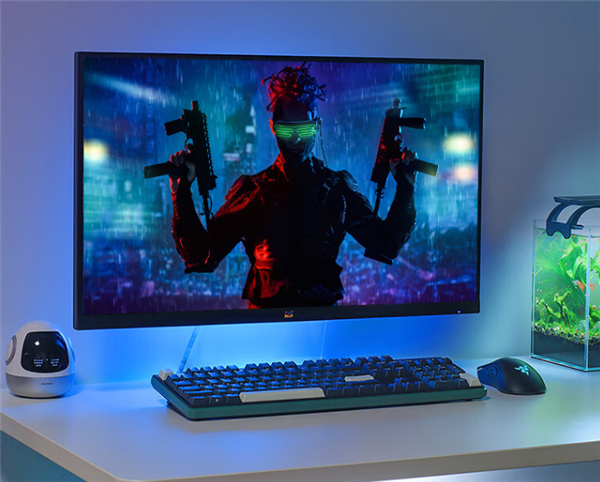 据悉,新款显示器采用三边微边框设计,耀夜黑机身,背面带有五向摇杆按键和更具立体感的压印LOGO,并加入了“V”字形装饰设计理念。