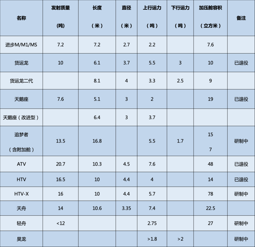 两款低成本货运运输工具都满足了方案召集时提出的性能指标。据称来自中科院的信息显示,轻舟飞船上行运输能力2.75吨,下行(销毁)能力2.9吨,均超要求的1.8吨和2吨指标。昊龙运力未透露,但官媒采用“较大的货物上下行能力”说法,说明它的运载能力也不低。下表是全球范围内所有货运飞船的比较。