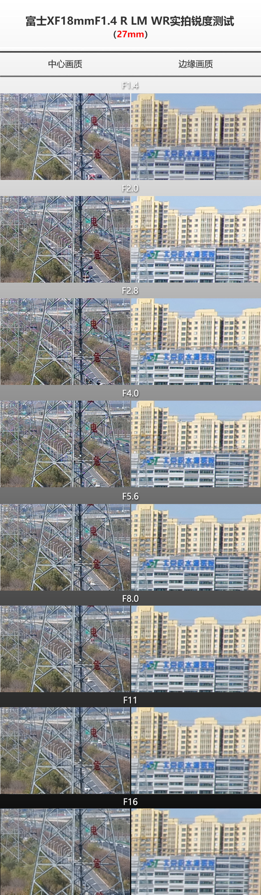 从实际测试和100%放大截图可以看出,XF18mm F1.4 R LM WR镜头展现了极高的分辨率水准,在整个光圈范围内都保持了出色的清晰度。即使在F1.4的最大光圈下,中心和边缘的画质依旧锐利清晰,这主要归功于其出色的光学设计,尤其是三片非球面镜片的应用。作为一款大光圈镜头,XF18mm F1.4 R LM WR的边缘画质锐度超出了预期表现,即便在F11光圈内画面也非常扎实,仅在F16时因光衍射的影响画质略有下降,但仍在可接受范围内。