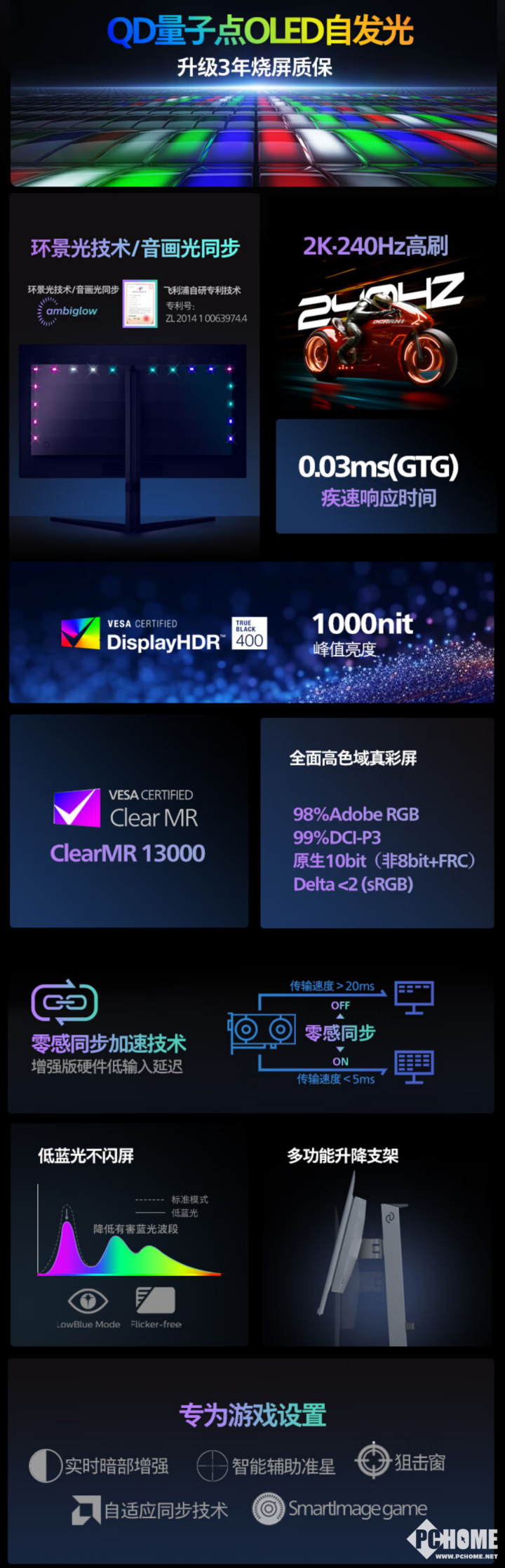 该款显示器采用了27英寸的QD-OLED面板,引入了量子点技术,可视角度为178度(水平和垂直),分辨率为2560 x 1440,刷新率为240Hz,响应时间(GtG)为0.03ms,峰值亮度为1000尼特。色彩方面,该显示器支持原生10bit色深,DCI-P3色域为99%,Adobe RGB色域为98%,sRGB色域为100%,DeltaE<2,支持Adaptive Sync技术,得到了ClearMR 13000和DisplayHDR True Black 400认证。
