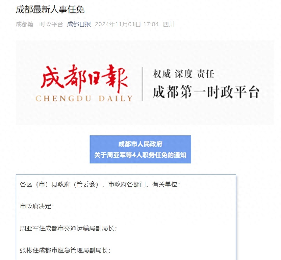周亚军任成都市交通运输局副局长;