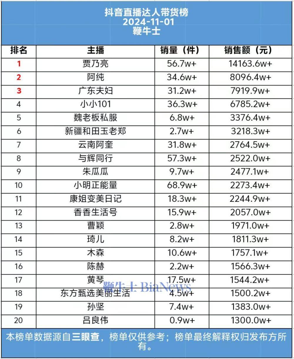 【直播带货日榜】是鞭牛士和三言科技推出的多个平台达人每日直播带货榜单。根据第三方数据平台“三眼查”提供的数据,鞭牛士将对抖音平台的达人带货交易量、GMV、播放量进行统计和分析,以供各位从业者参考。