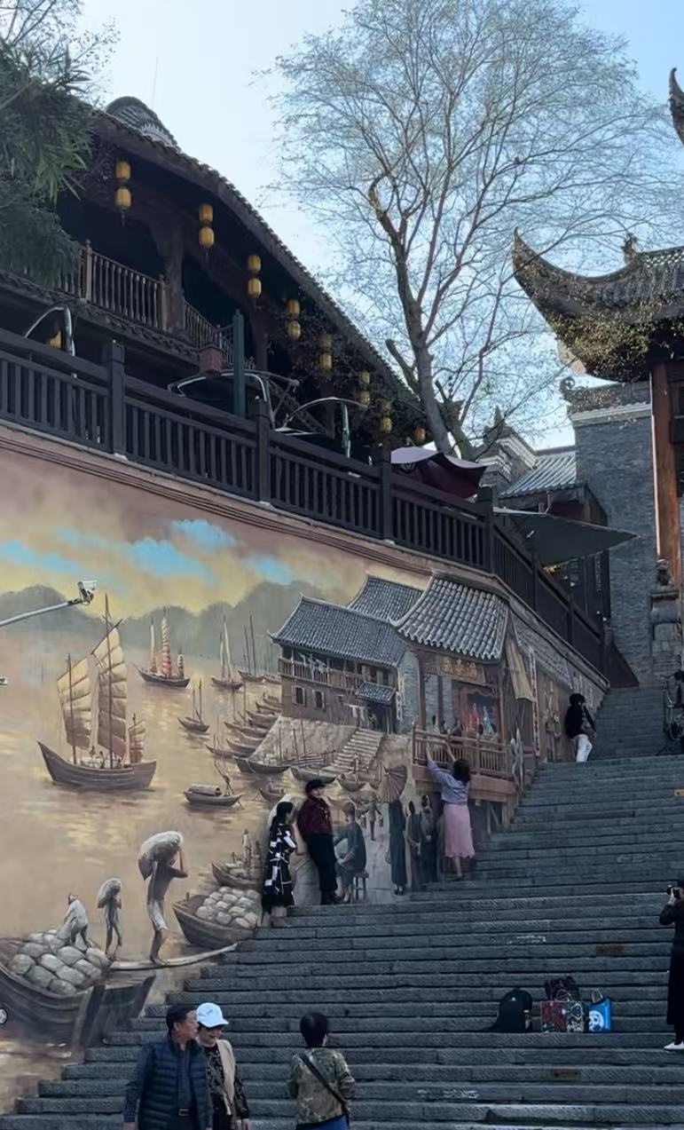 从园博园地站口b2出口出来,左手边的台阶上就是依次展开的老武汉画卷,虽然是工作日,但是来拍照的人络绎不绝,姿势五花八门。一位女士身着旗袍,模仿壁画里人物的造型来拍照。