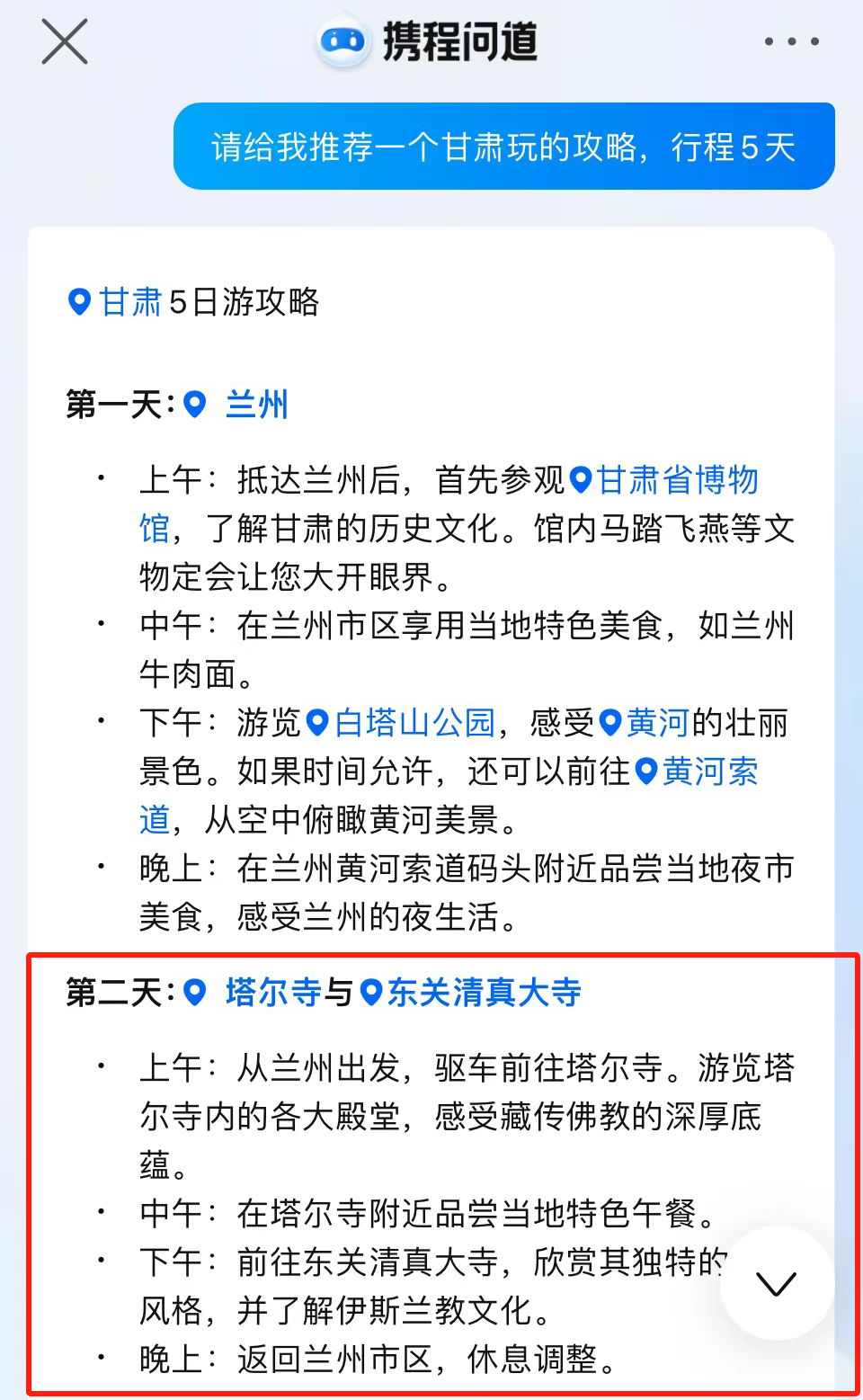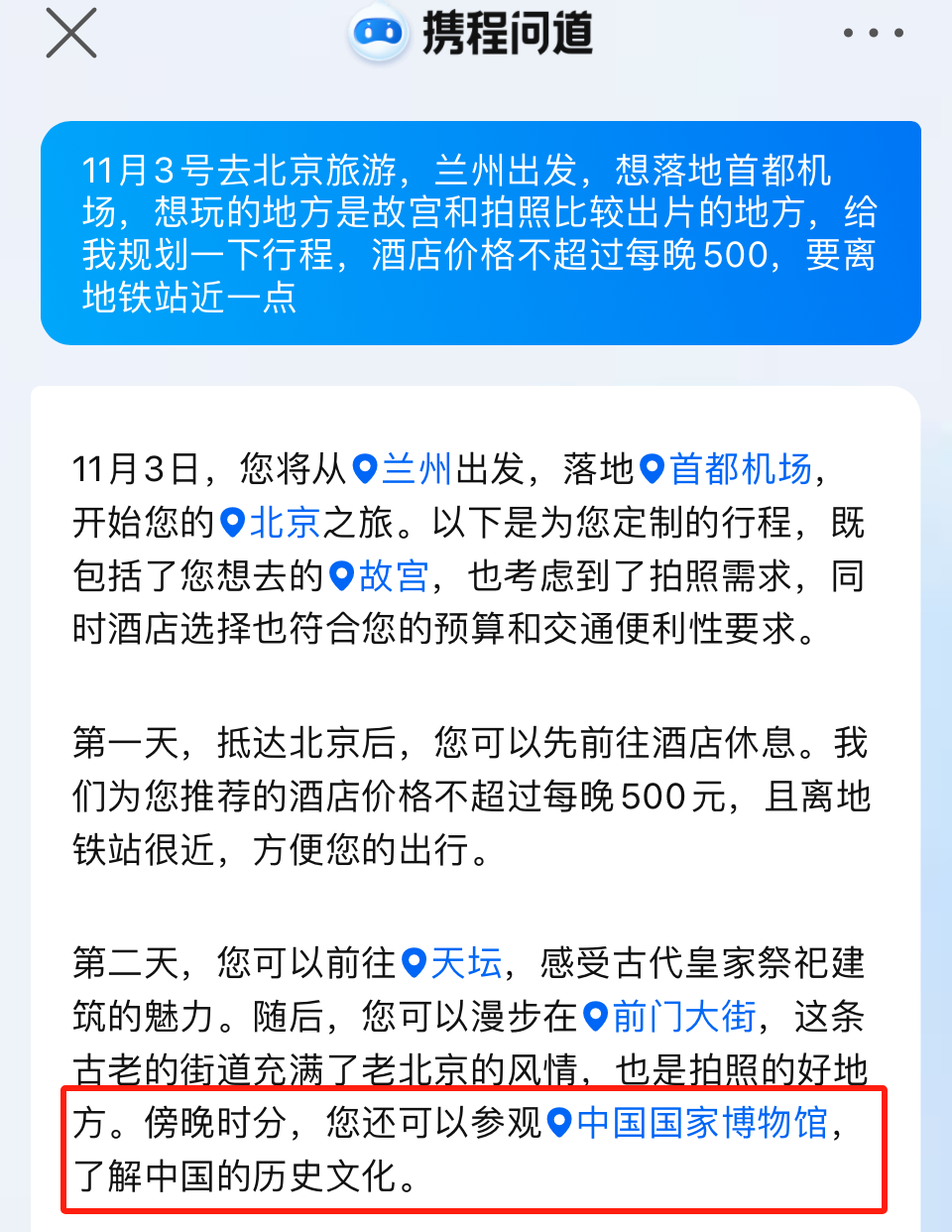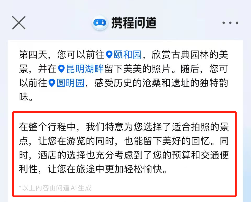 所以许多用户把自己的旅游计划交给携程问道安排,是希望可以找到更省心的解决方案,虽然AI助理不可能完全代替消费者的决策,但是起码也要给出更贴近实际的方案嘛。