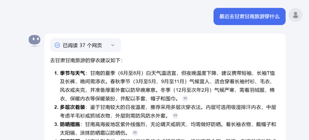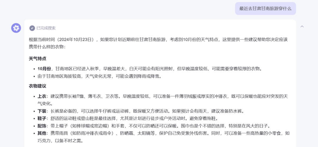 结果问道说,甘南的天气未提供。咋的?直接绕过了,咱就不能买个天气数据吗,这不是旅游必备的吗,实在不行,咱不用大模型,咱用爬虫抓都能抓出来天气数据啊。