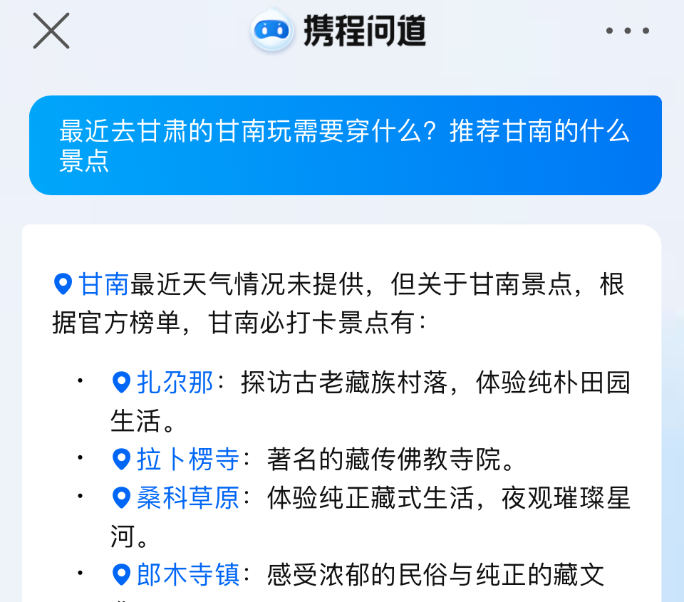 然后朋友又问携程问道,最近去甘肃的甘南玩需要穿什么?推荐甘南的什么景点?其实是想为难一下携程问道,因为甘南天气已经很冷了。