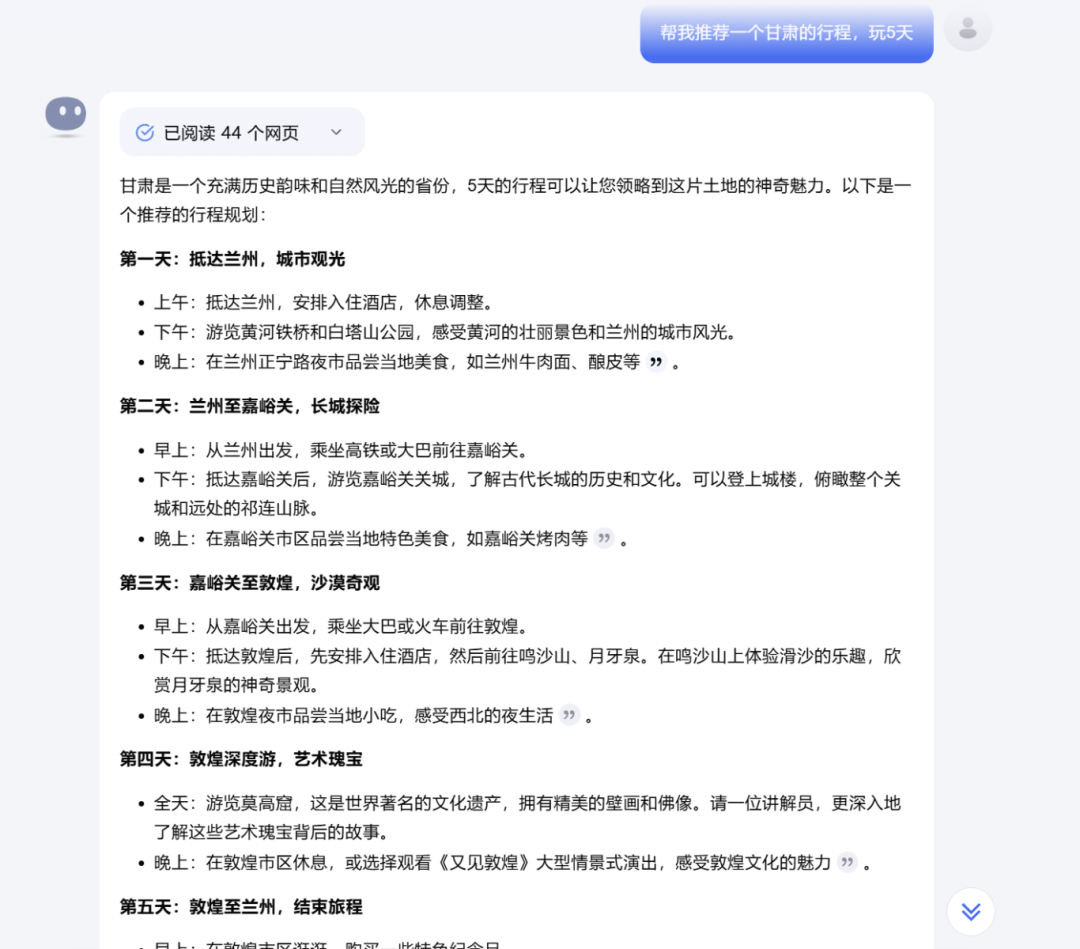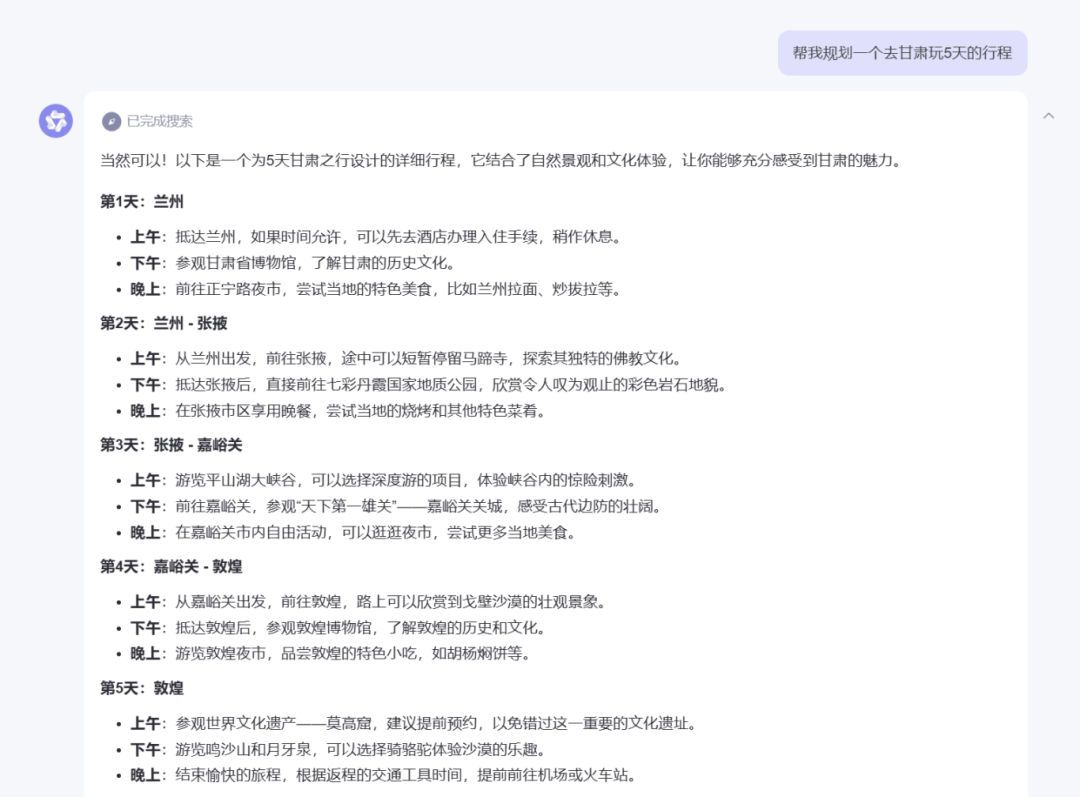 但我朋友他不信邪啊,觉得这不是大模型的问题,是他提问的问题,然后就又试验——去甘肃旅游5天推荐哪里?