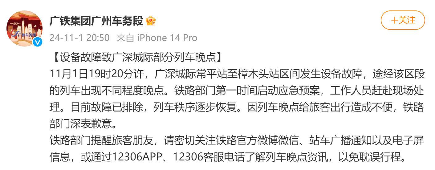 11月1日19时20分许,广深城际常平站至樟木头站区间发生设备故障,途经该区段的列车出现不同程度晚点。铁路部门第一时间启动应急预案,工作人员赶赴现场处理。目前故障已排除,列车秩序逐步恢复。因列车晚点给旅客出行造成不便,铁路部门深表歉意。