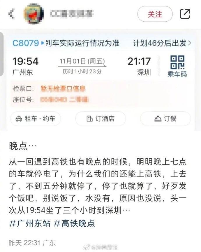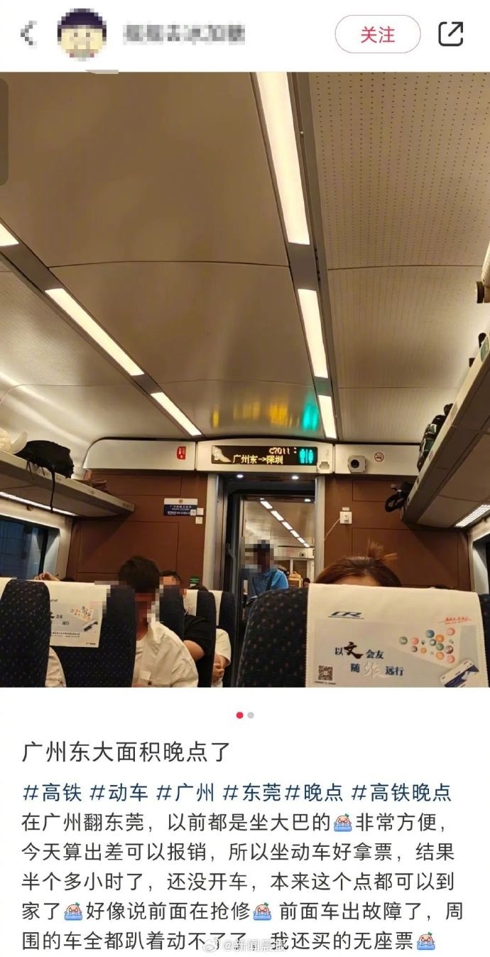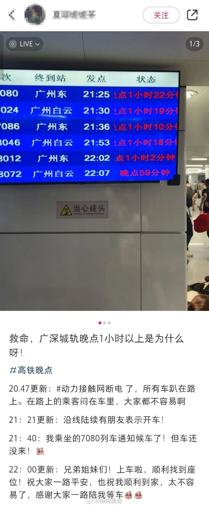 11月1日,不少网友在社交平台上发帖称,广深和谐号城际线路出现大面积晚点现象。据多位网友现场图片显示,广深城际多班列车晚点1个小时以上。