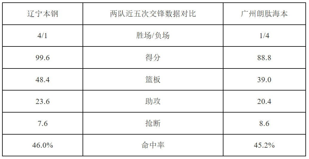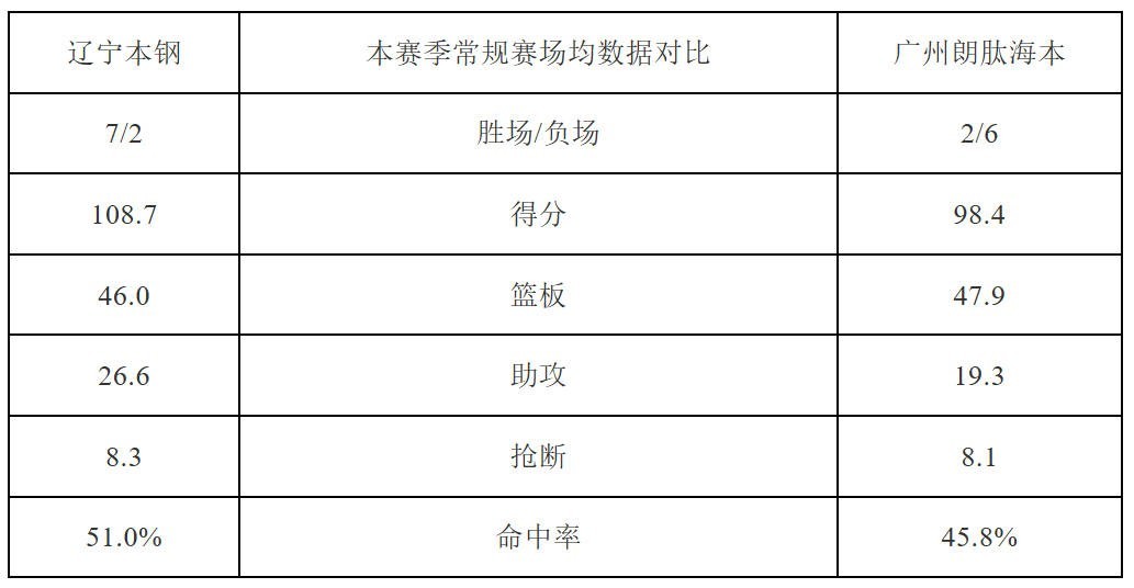 本赛季两队交手1次,辽宁本钢客场120-88战胜广州朗肽海本。