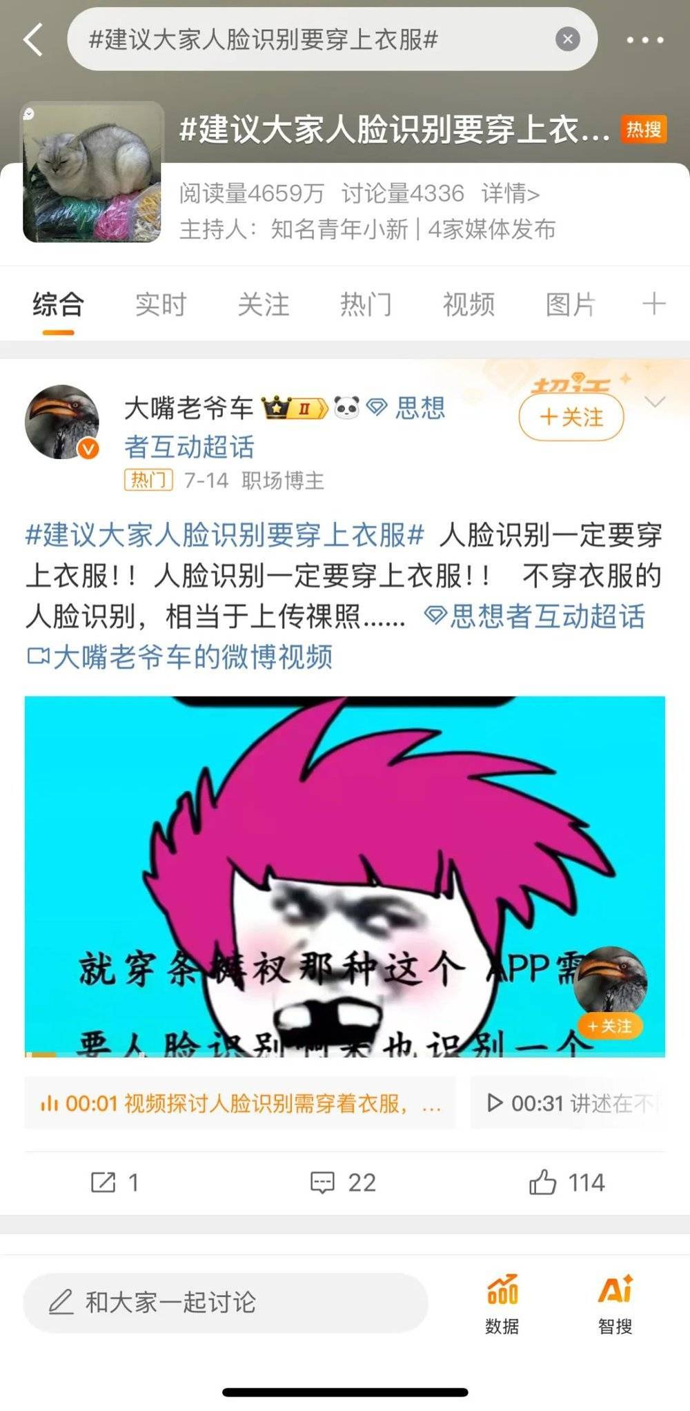 ▲“建议大家人脸识别要穿上衣服”在微博热议