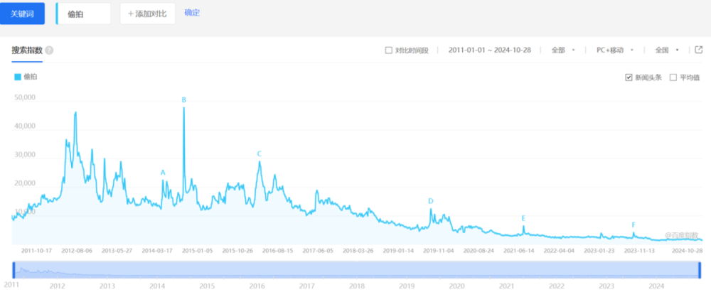 ▲百度指数,过去十年涉及偷拍的国内新闻