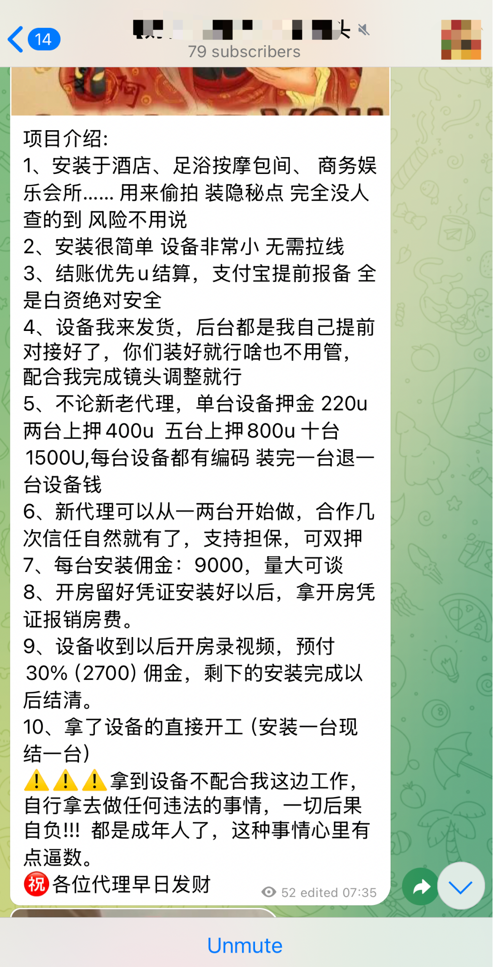 但如果你将这部偷拍设备安装到民宿或者酒店,并配合他完成设备调试,那么他不仅可以将押金全部返还、报销开房费用,还会提供一台设备4500U~9000U(一种和美元挂钩的加密货币,1USDT等于1美元)的安装费用。