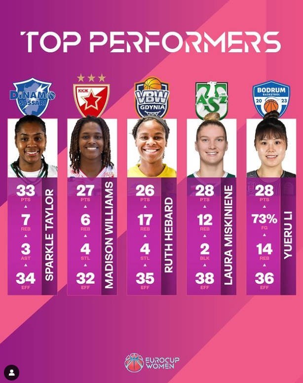 10月31日,李月汝在欧俱杯对阵匈牙利Sopron的比赛中,爆砍28分14个篮板。