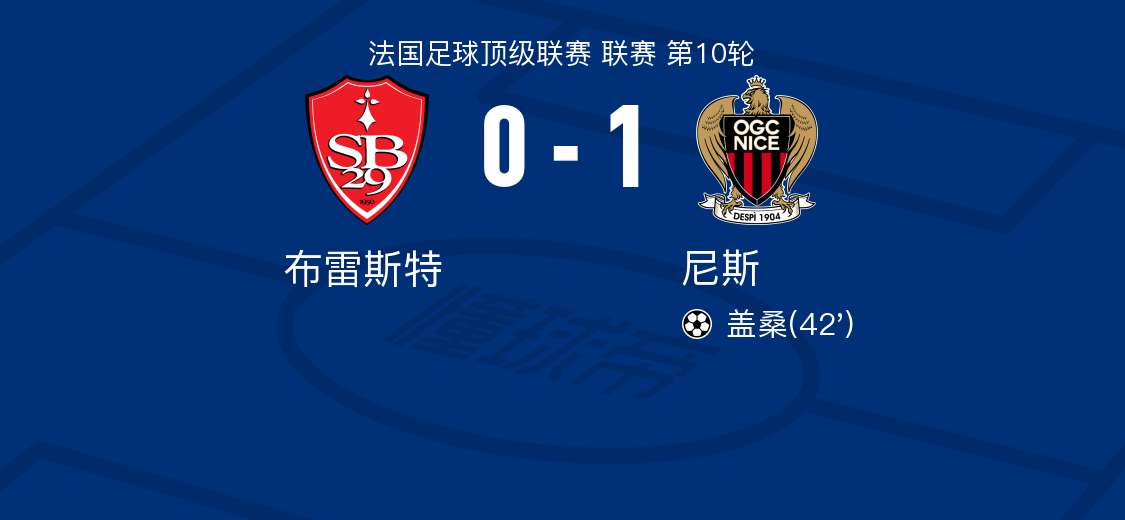 在法国足球顶级联赛第10轮的较量中,布雷斯特坐镇主场迎战尼斯。比赛中,尼斯的盖桑在阿卜迪的精妙助攻下成功破门,为球队取得领先。最终,尼斯凭借这一进球,以1比0小胜布雷斯特,收获了宝贵的三分。