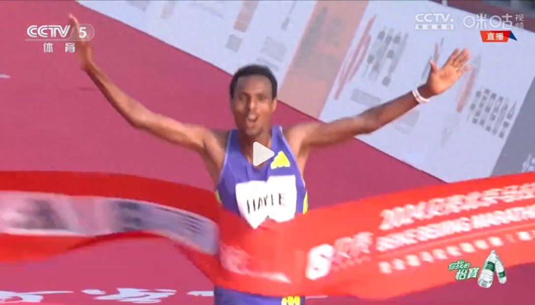 11月3日,2024北京马拉松暨全国马拉松锦标赛,埃塞俄比亚选手莱米-伯哈努-海勒率先冲过终点线,夺得2024北京马拉松冠军。
