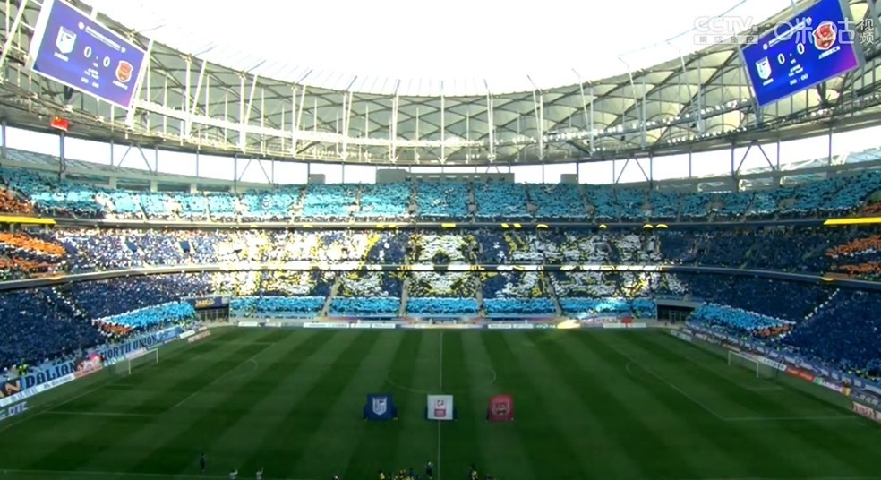 比赛开始前,大连英博球迷在看台打出了“前进吧,大连队”的巨幅TIFO,以此来给球队加油打气。